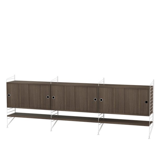 In der edlen Kombination aus warmem Walnuss und klassischem Weiß bringt dieses Möbelstück Ruhe und Eleganz in jeden Raum. Drei identische Segmente à 80 cm Breite fügen sich zu einer harmonischen Einheit zusammen. Die filigranen String-Bodenleitern in 85 cm Höhe verleihen dem Sideboard eine luftige Leichtigkeit, während die mit dunklem Walnussholz furnierten Fachböden und Schiebetürschränke für einen besonders hochwertigen Look sorgen.