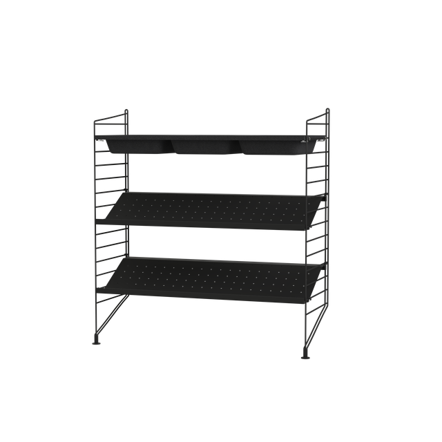 Das String-Regal ist äußerst einfach zu montieren: Die Grundlage bilden leiterähnliche Seitenwände, in die die einzelnen Elemente eingehängt werden. Zur Auswahl stehen nicht nur Einlegeböden, sondern auch Schränke mit Schiebetüren aus Holz oder Glas, Schubladenschränke, Schränke mit seitlich öffnenden Schwenktüren sowie solche mit nach oben öffnenden Klapptüren. Darüber hinaus bietet das Sortiment Schreibtischplatten, Klapptische und eine Vielzahl von Accessoires wie Magazinhalter und Aufbewahrungsboxen.